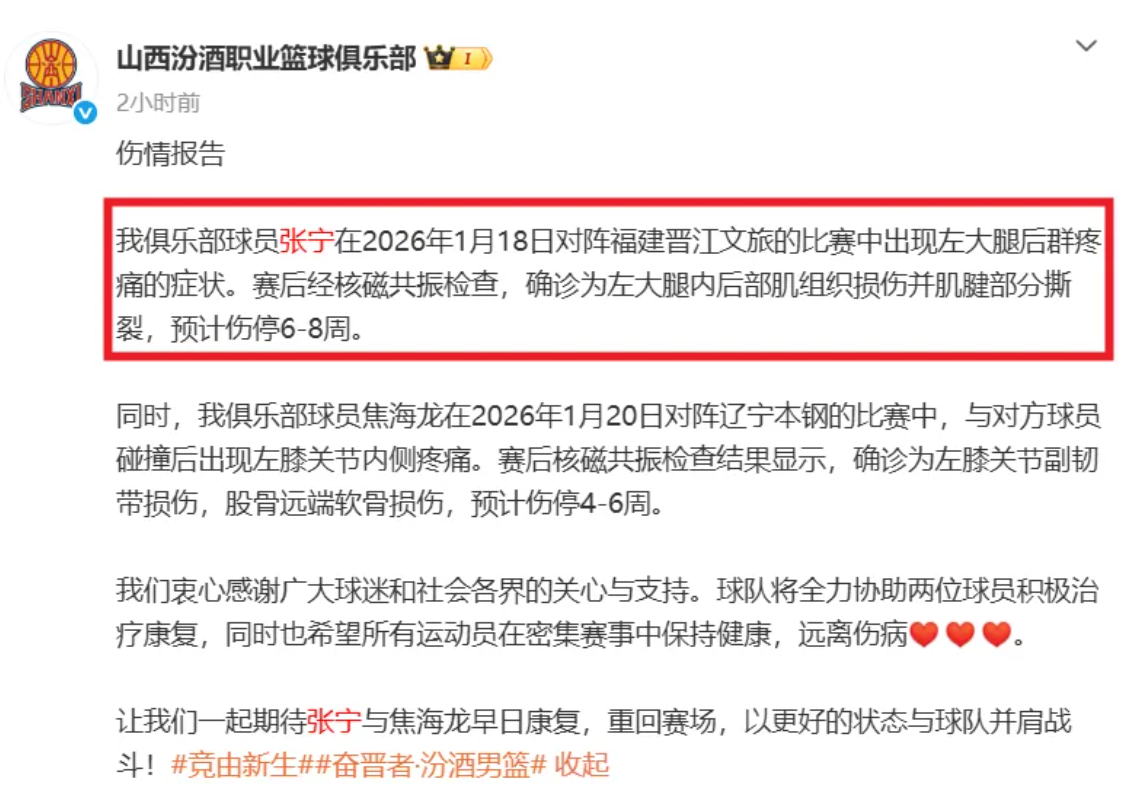 kaiyun-至少伤停6周!张宁严重拉伤,山西男篮官宣